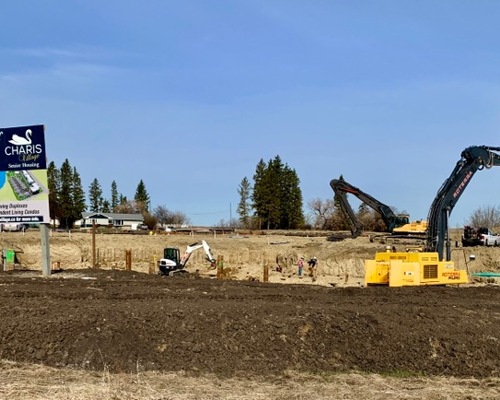 Chinook Villa is going up! Eagle Builders is constructing this 4 story condominium with pre-cast concrete sandwich panel walls that are formed in Blackfalds and trucked to the building site. There, a massive 190 foot boom crane is setting the wall panels in place. Some of the excellent reasons that Charis Village designed this type of building are as follows: 1) The building and roofing system are extremely strong and durable. The steel and concrete insulated structural walls are 10" thick. 2) The walls …